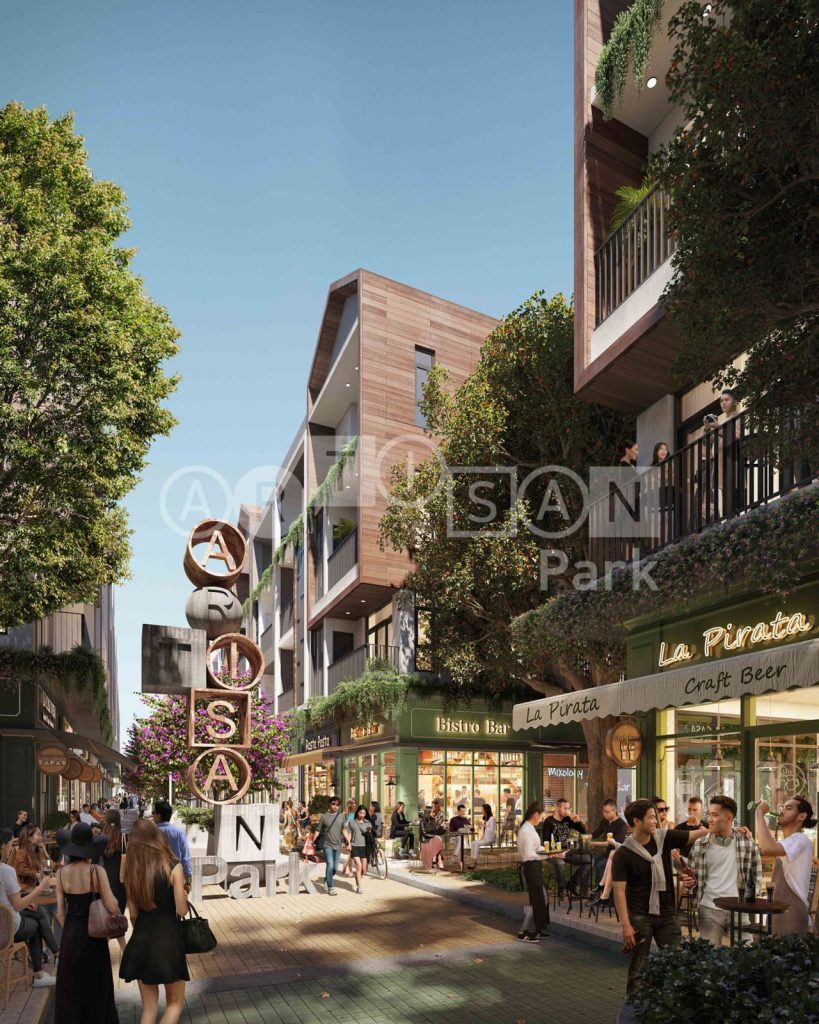 Artisan Park thiết kế với những lối đi bộ rộng rãi chỉ dành được tô điểm bởi những mảng xanh mát. Tận dụng không gian ngoài trời thoáng đãng để “nới rộng” cửa hàng cũng như tiềm năng thương mại.