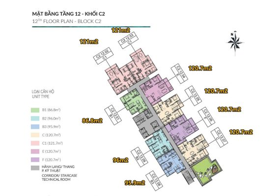 - Kết cấu: Gồm 6 tháp căn hộ C1-C6, mỗi khối tháp cao từ 13-14 tầng